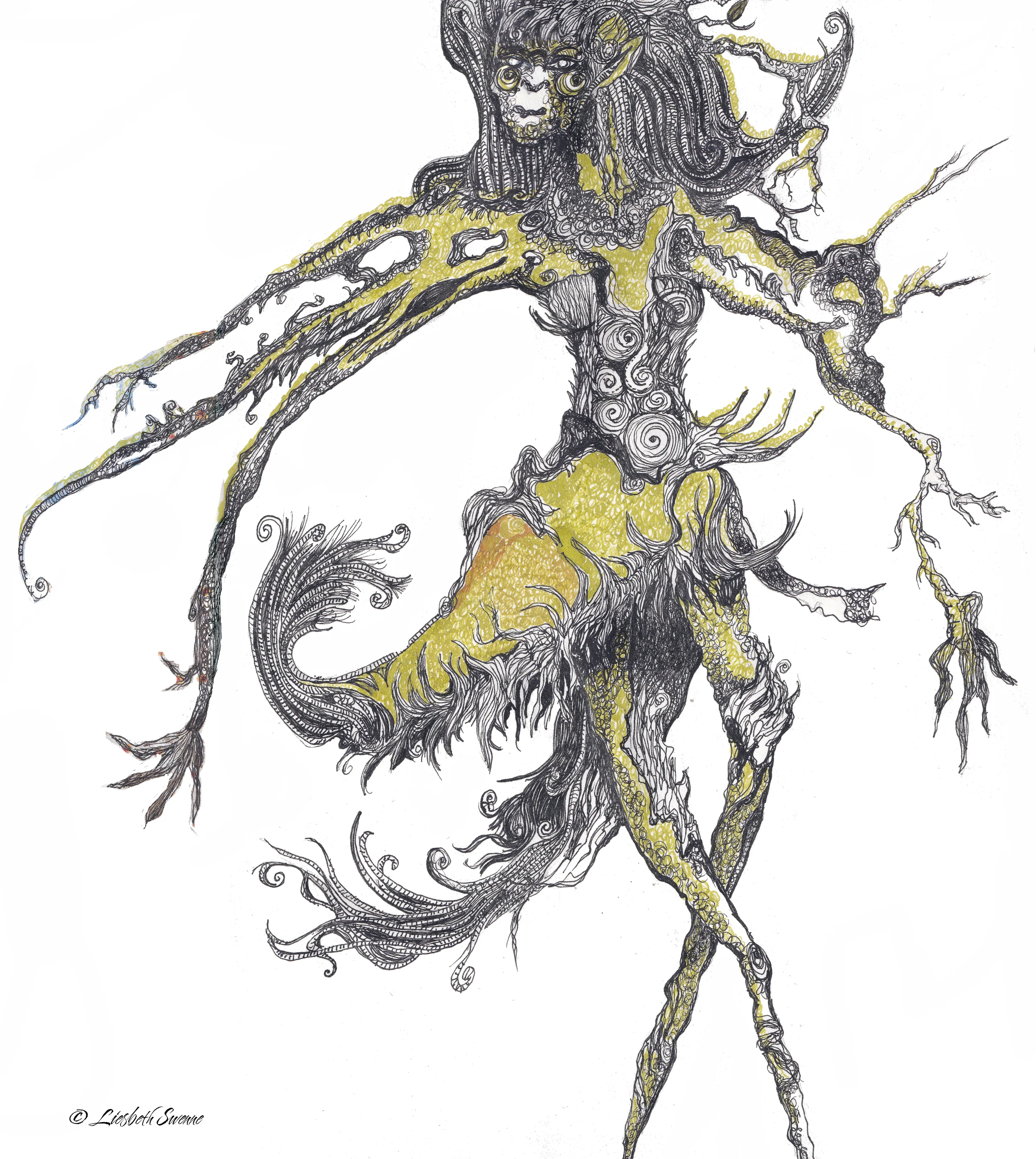 This artwork began with an encounter. While observing a fallen tree, a figure revealed herself within its form. She was not imagined or constructed, but recognized — her presence already held in the curves of wood, root, and fracture. The drawing records that moment of recognition.